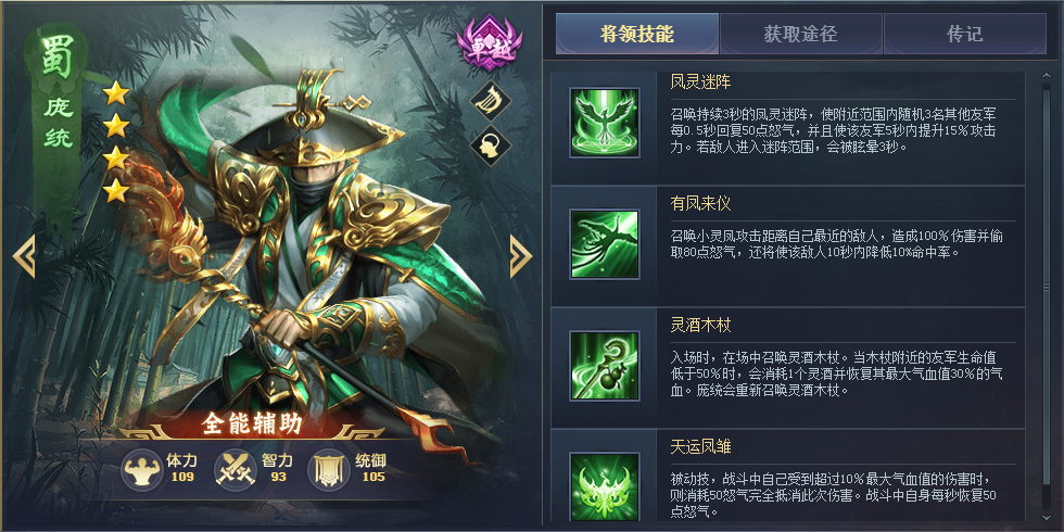 半辅助半输出将领,输出较高高,三技能开局加急速恢复怒气,能让己方武将更快的释放技能,能搭配四技能降低防御,让己方打人伤害更高。
